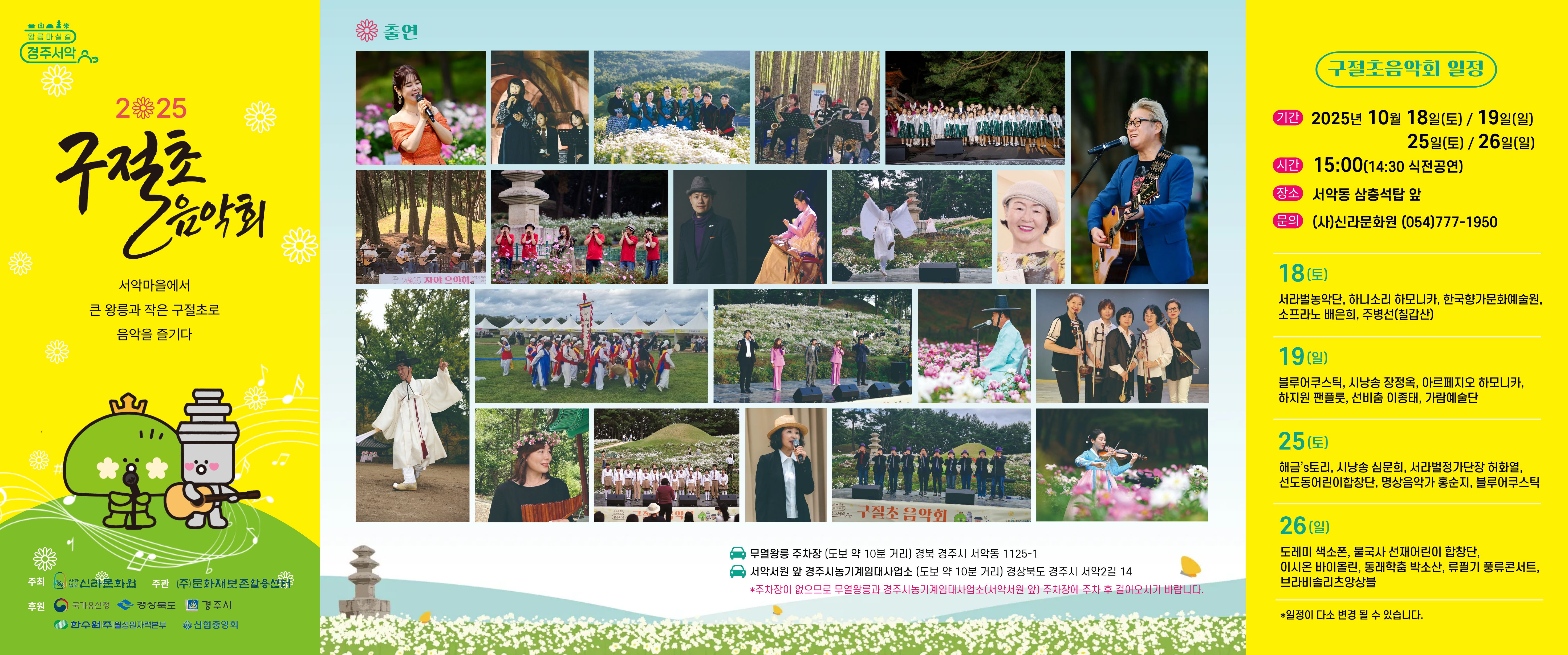 - 경주시 구절초음악회는 매년 가을 서악마을 삼층석탑 앞 구절초꽃밭을 무대로 열리는 실경(實景) 공연입니다. 인공무대 대신 자연경관을 배경으로 삼아, 음악과 문화유산이 어우러지는 것이 특징입니다. 국악·재즈·클래식·합창·시낭송 등 다양한 장르의 공연이 펼쳐지며, 관람객은 가을 정취와 함께 신라의 역사·문화 감성을 체험할 수 있습니다. 경주시가 주최하고 지역 예술인들이 참여하는 대표적인 가을 야외 문화축제입니다.